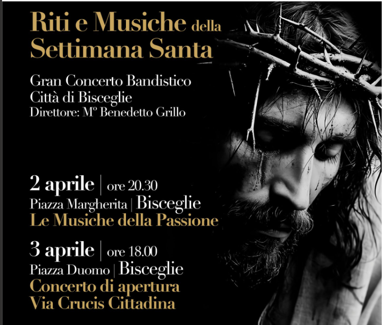 Giovedì 2 aprile, alle ore 21:00, in Piazza Margherita, andrà in scena “Le Musiche della Passione”, il tradizionale concerto delle musiche della Settimana Santa a cura del Gran Concerto Bandistico “Città di Bisceglie”, diretto dal Maestro Benedetto Grillo.