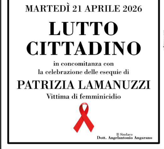 In segno di cordoglio per la tragica scomparsa della concittadina Patrizia Lamanuzzi, vittima di femminicidio, è stato proclamato il lutto cittadino per martedì 21 aprile, giornata in cui si svolgeranno i funerali, previsti alle 15:30 nella parrocchia Santa Maria Madre della Misericordia.